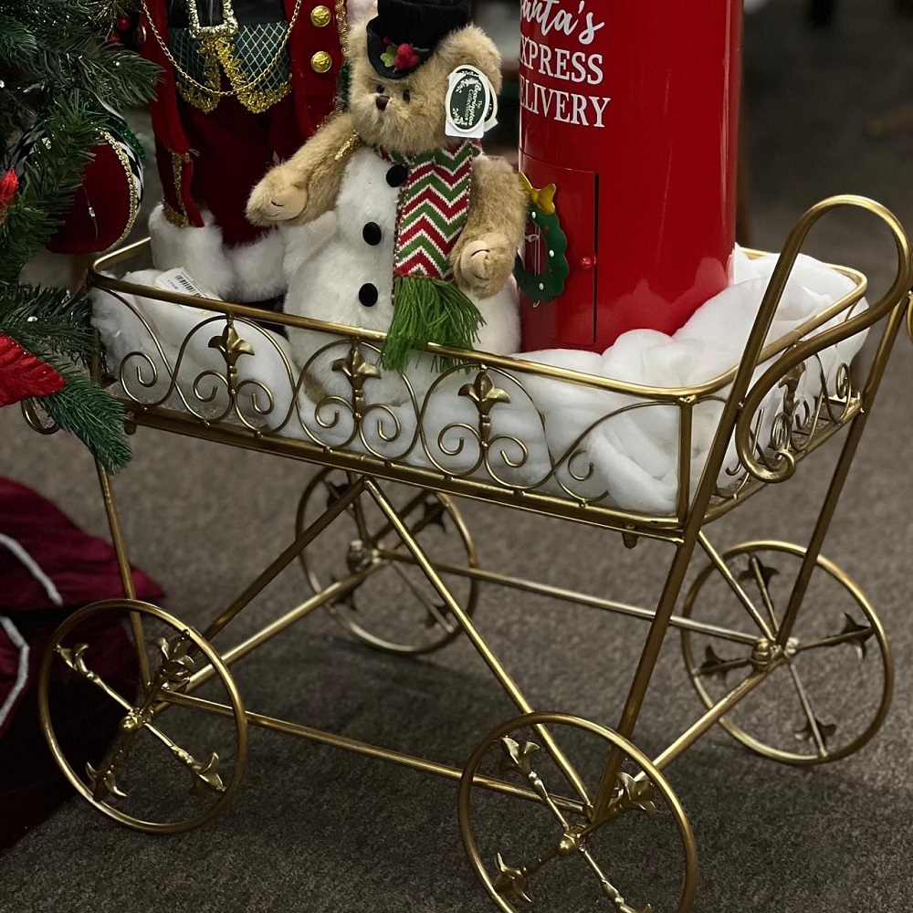 Тележка кованая золотого цвета идеально подойдёт как подставка для цвктов, так и для новогоднего декора.