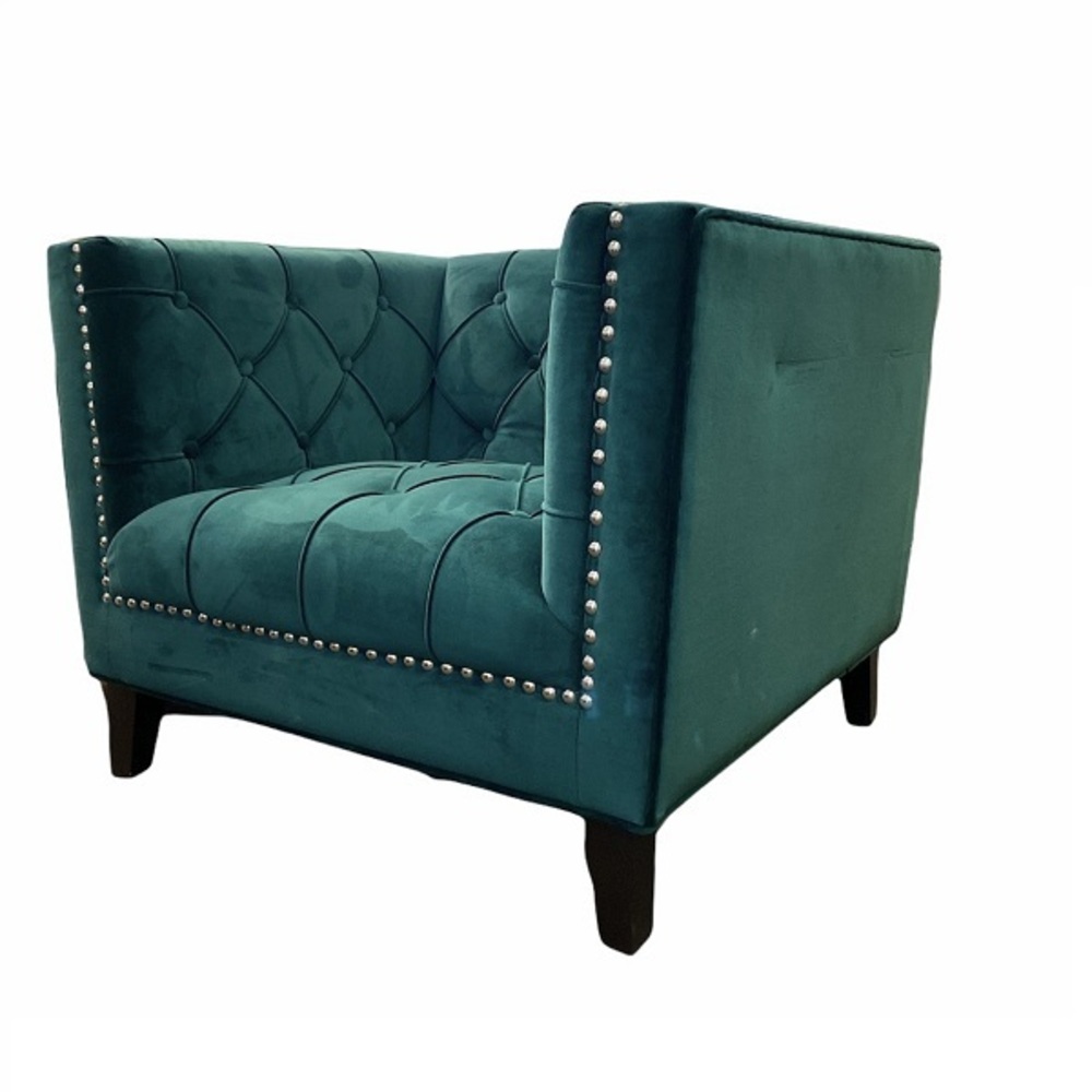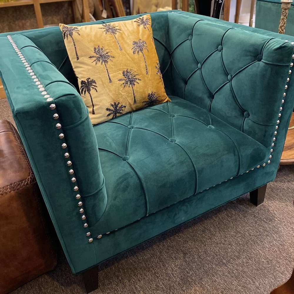 Глубокое зелёное кресло с подлокотниками и бархатной обивкой придаст любому скромному интерьеру дух роскошных бутик-отелей.
