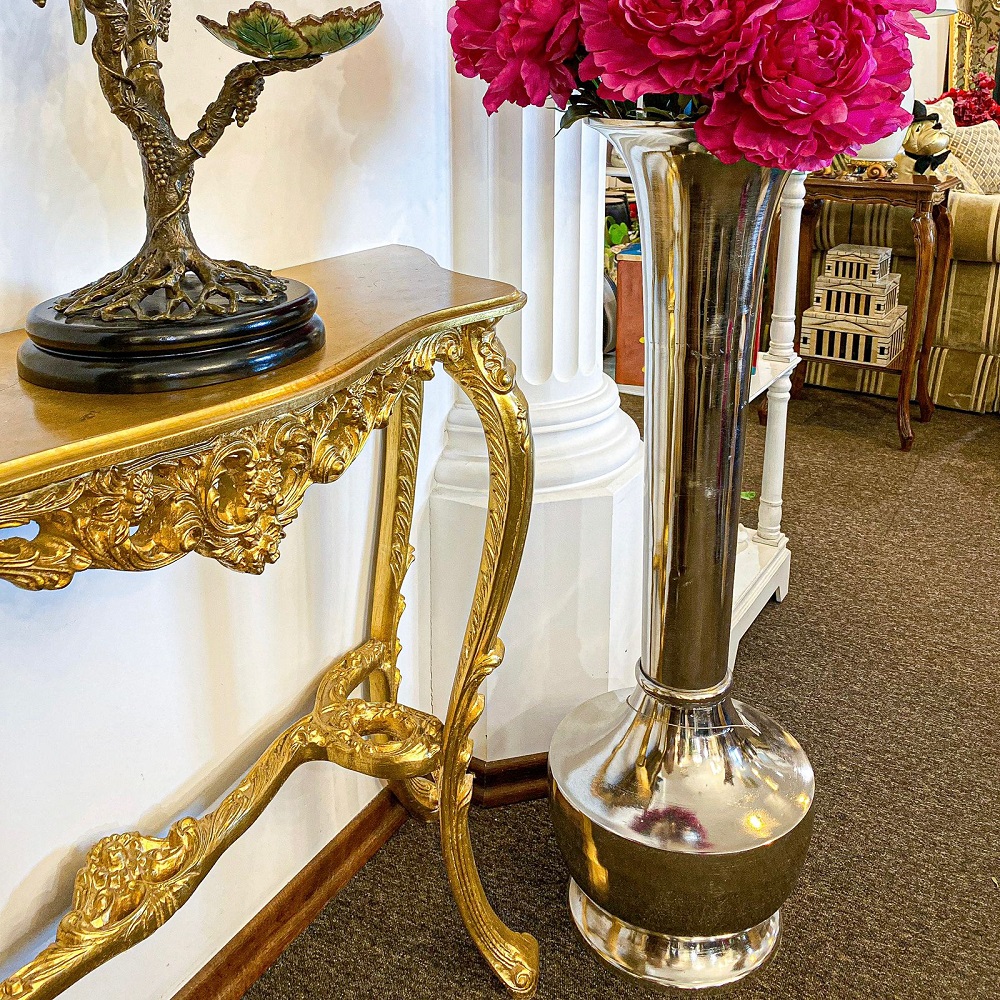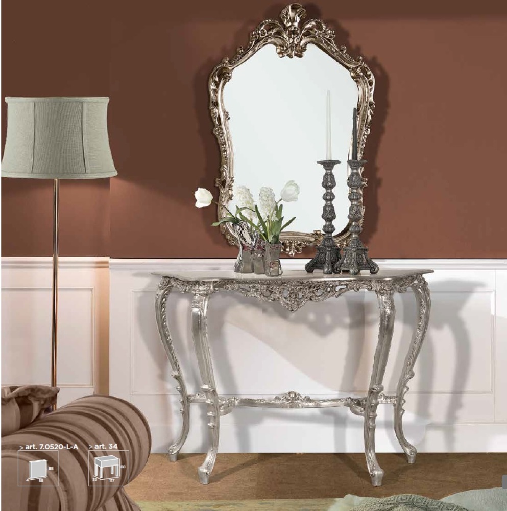 Эта консоль адресована ценителям прекрасного. У неё четыре гнутые ножки-кабриоли украшенные резьбой, красивые резные фартук и царга. Фигурная столешница выполняет функцию подставки. Эффектный столик предназначен для представительных зон. Все поверхности покрыты сусальным золотом.