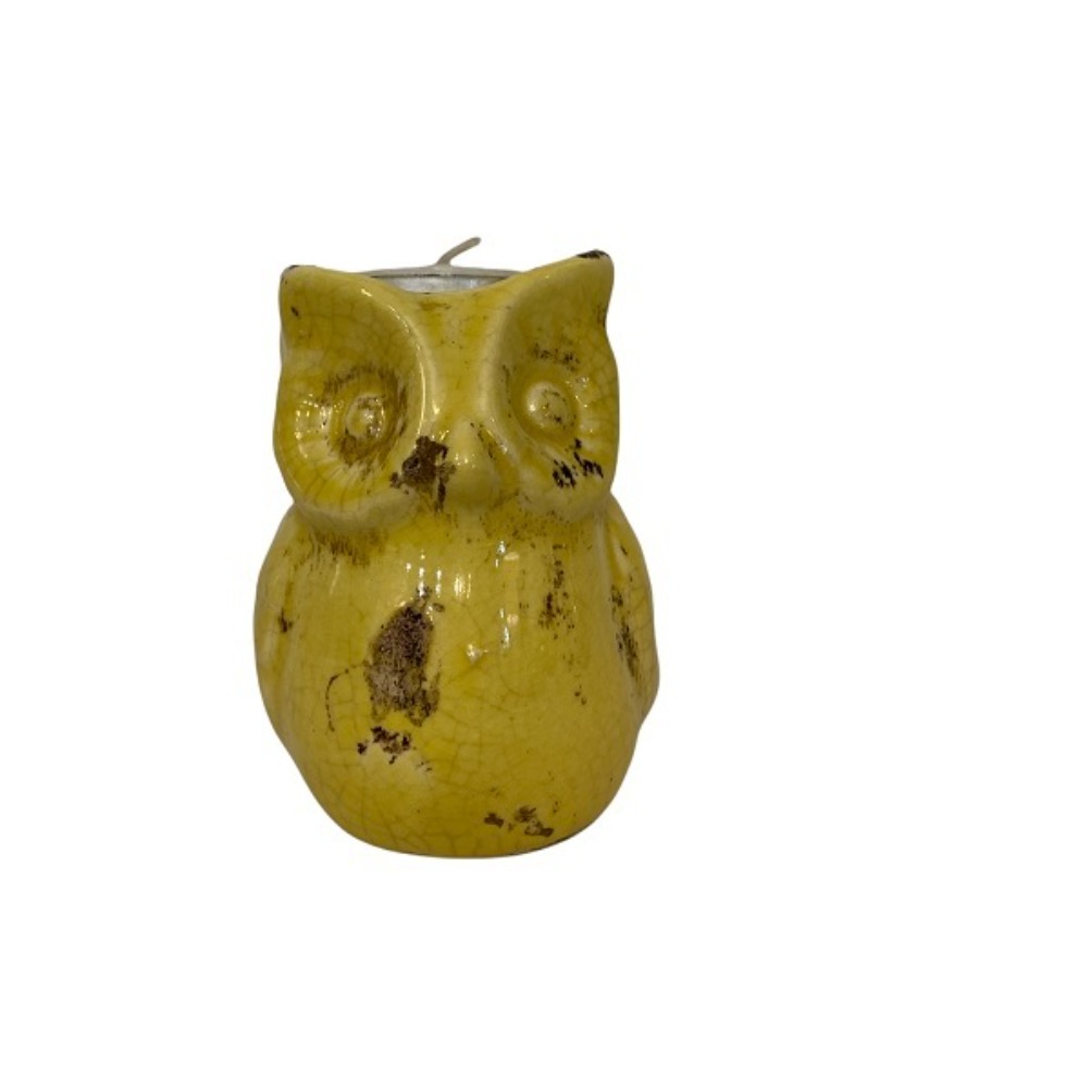 Маленький подсвечник Сова изготовлен из искусственно потрескавшейся керамики в немного состаренном жёлтом цвете. Будет трогательно смотреться в интерьере вашего дома.