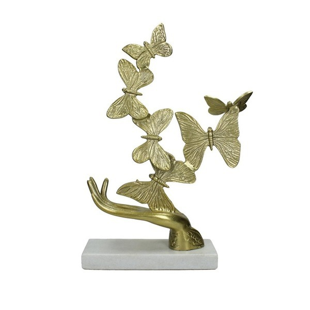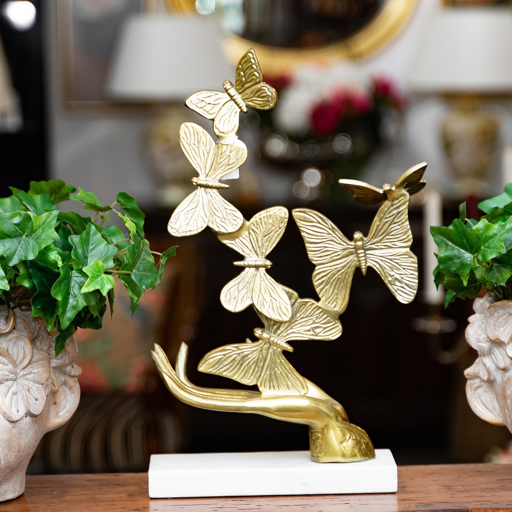 Простое, но изящное изделие в виде женской руки и игривой стаи бабочек. Их золотистый цвет создаёт ауру чувственности, делая современную скульптуру привлекательной для всех. Очень красивый и символичный подарок.