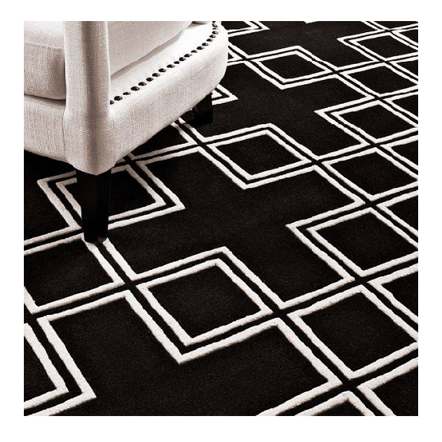Чёрно-белый ковёр с графическим рисунком, выполнен вручную. Имеет приятный блеск.