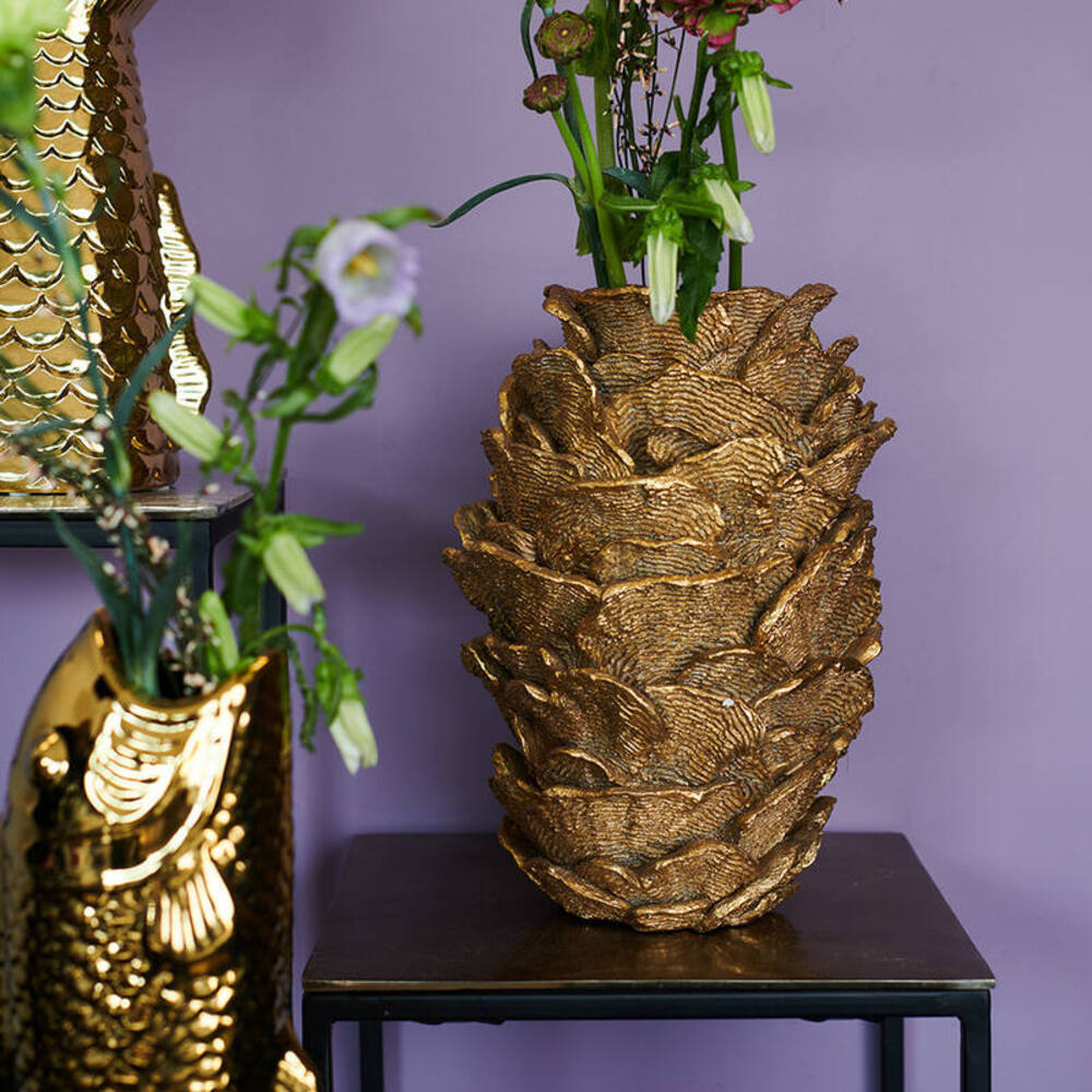Ваза в форме шишки может быть прекрасной деталью для различных композиций, например, шикарных букетов из листьев и искуственных ягод или еловых веток. Придаст оттенок естаственности вашему интерьеру и хорошо сочетается с любым декором.