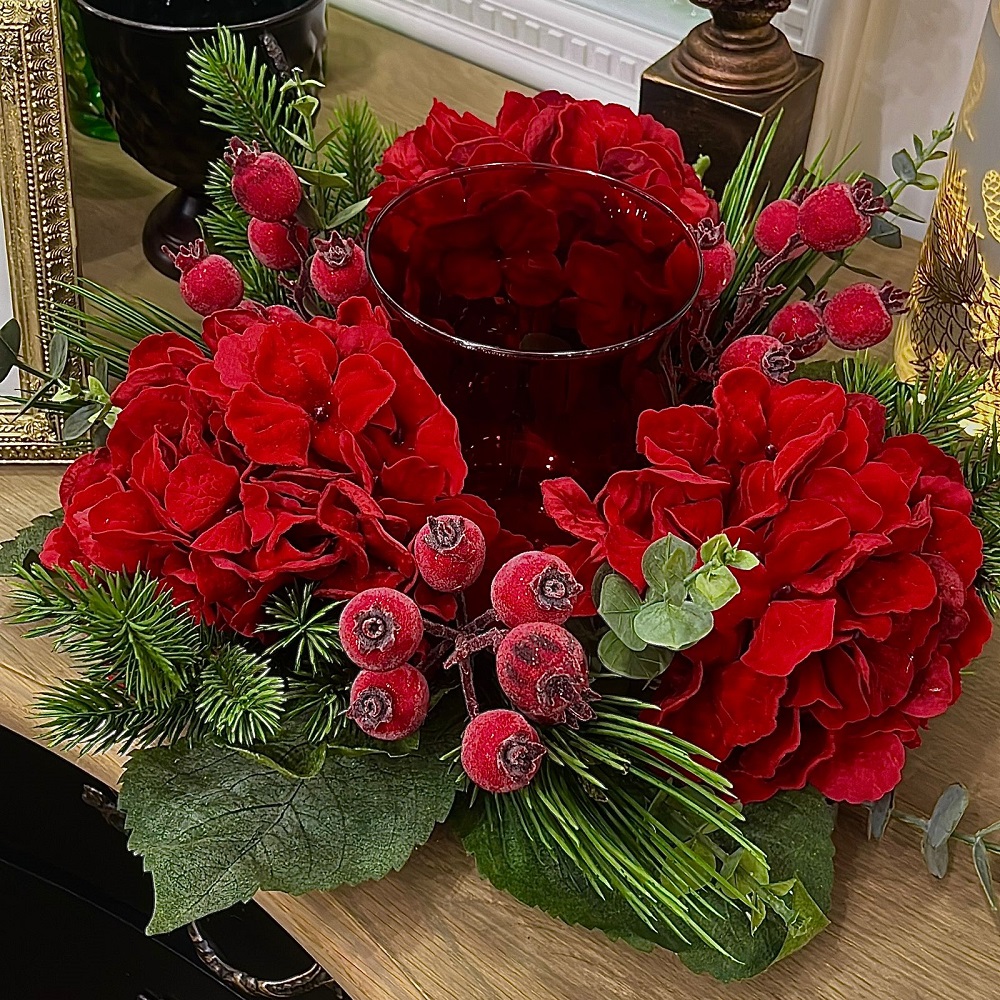 Нарядный подсвечник с гортензиями для украшения новогоднего стола или любого другой праздника.
