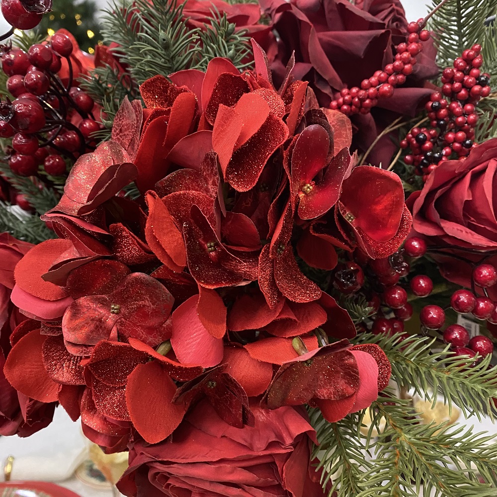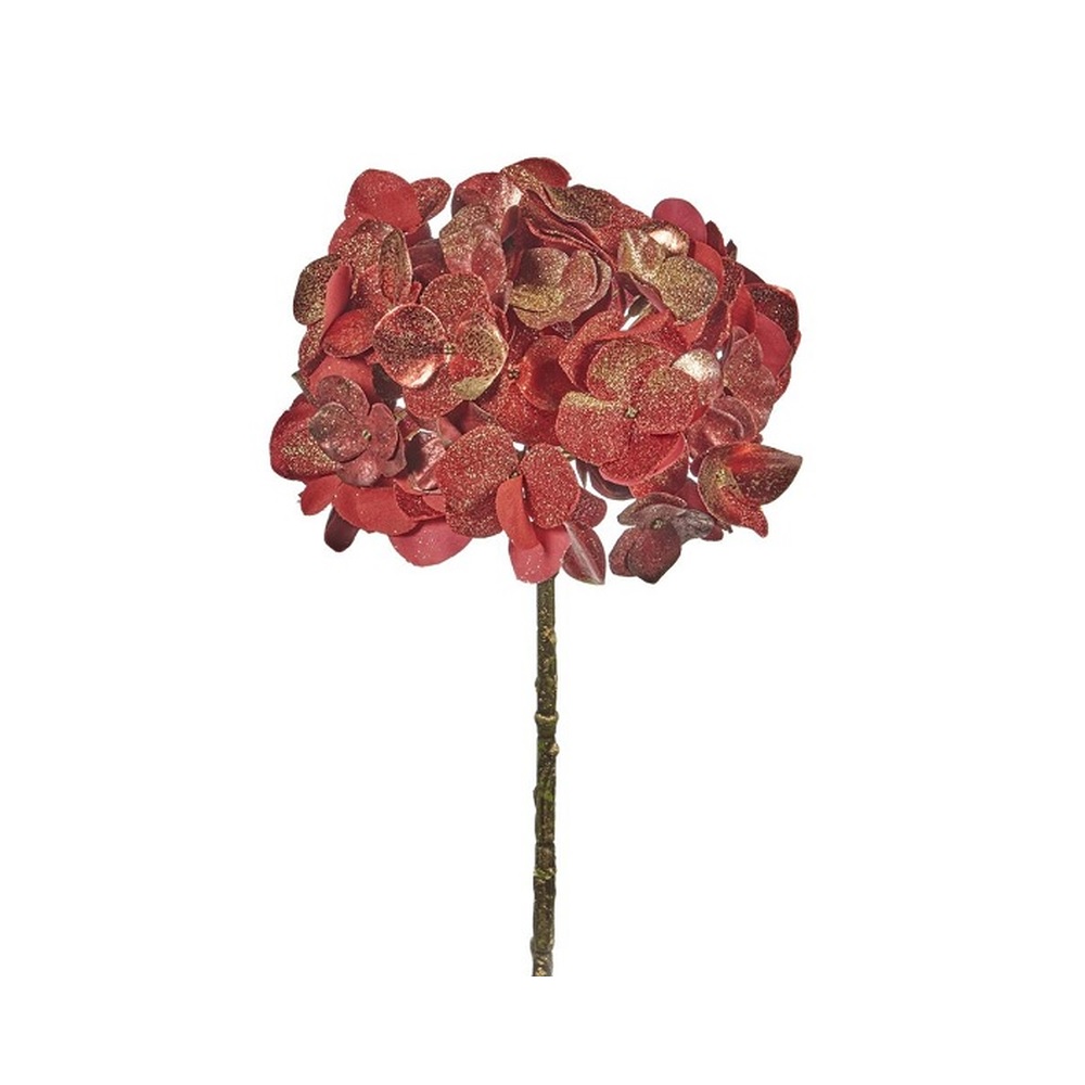 Декоративная ветка с красной гортензией отличается рядом преимуществ: - она реалистична, не требует полива и пересадки, долговечна и устойчива к температурным перепадам, сохраняет текстуру и яркость красок на протяжении нескольких лет. Такими цветами могут быть украшены банкетные зоны, столы, пространство дома и офиса.