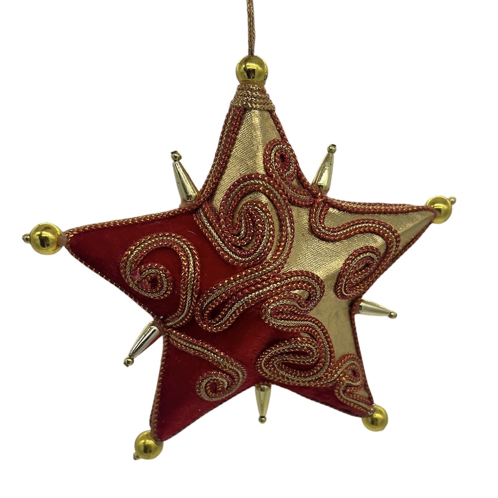 Красные шары разной формы украшены золотистым узором и орнаментом.
