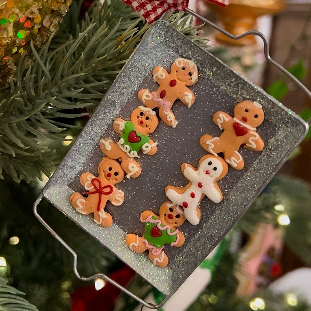 Оригинальное украшение для Вашей ёлки – игрушка в виде подноса с имбирными пряниками. Красивые пряники с яркой глазурью как будто только что достали из печи. Игрушка компактная и интересная, обязательно привлечёт внимание и достойно впишется в праздничную композицию украшений. Дополнена клетчатой текстильной лентой для подвески.